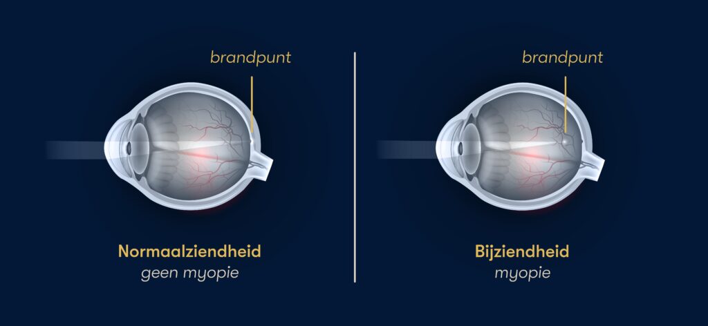 Wanneer je van dichtbij wel goed kunt zien maar voor veraf niet, dan ben je myoop. De Nederlandse benaming voor Myopie is bijziendheid. Het wazige zicht veraf ontstaat door dat de lengte van het oog te lang is. De afbeelding waarnaar je kijkt in de verte valt dan voor het netvlies. Door het dragen van een bril of contactlenzen met een min-sterkte kan deze oog fout weer gecorrigeerd worden.